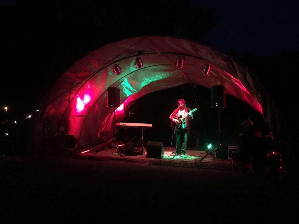 Am Abend gab es am Donnerstag ein super gemütliches Kino im Zirkuszelt; am Freitag spielten Bands auf der Hauptbühne, am Freitag gab es später ein upgespacetes Konzert mit Kamanko und eine legendäre Party mit Geschrammel im Karnak – auf jeden Fall eins der Highlights. Die Küfa versorgte uns die ganze Zeit über mit leckerstem Essen, zumeist aus geretteten oder gespendeten Lebensmitteln. Im Nachhinein eine krasse Leistung, dass wir die ganzen Genehmigungen, die Infrastruktur, das Material und die Spenden, die Küche, die Workshops, das Abendprogramm, Awereness, PR, in einem so kurzen Zeitraum (effektiv 8 Wochen Vorbereitung) organisiert bekommen haben!