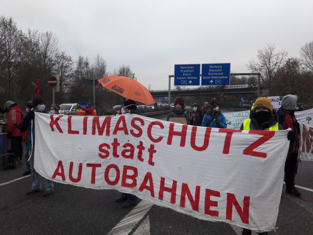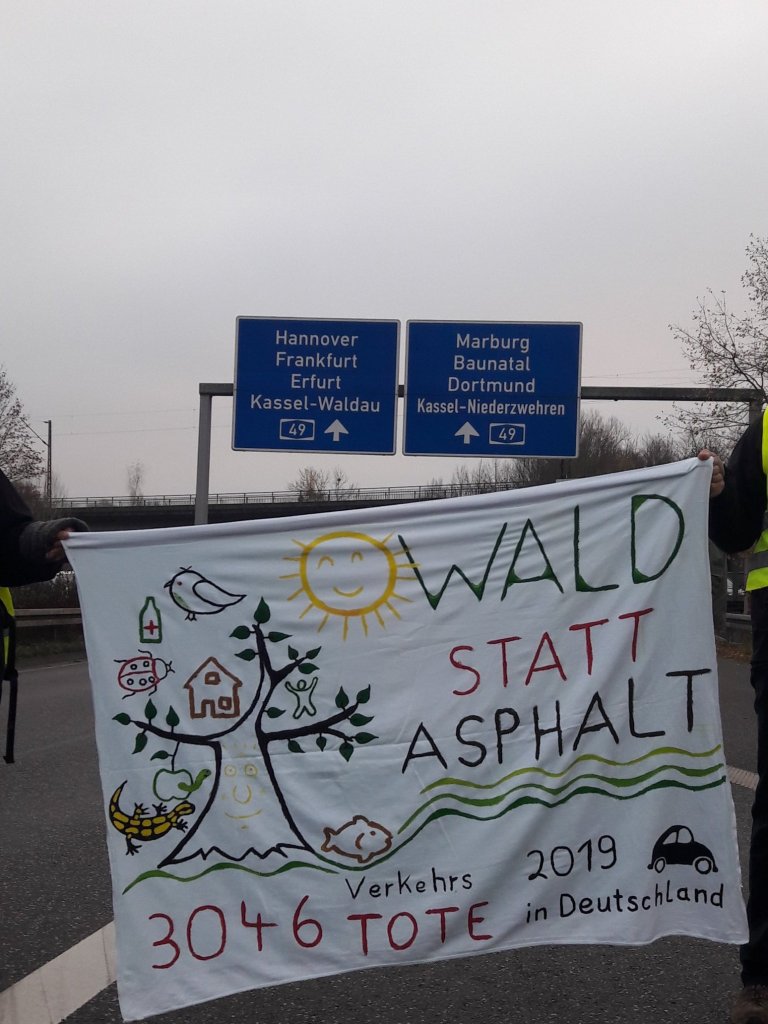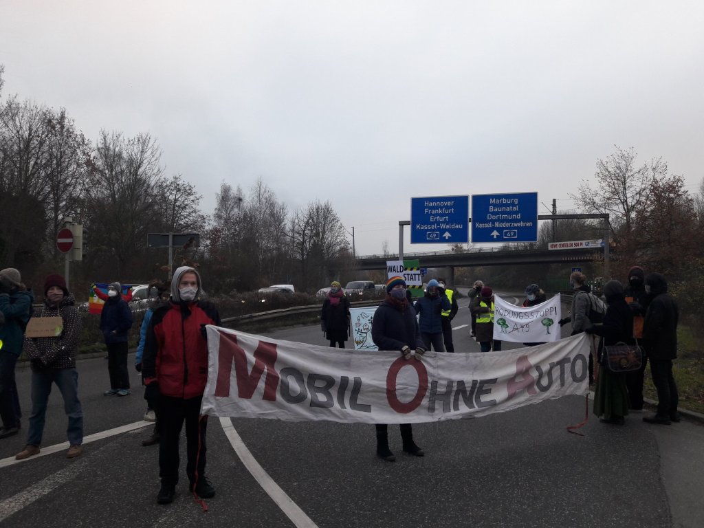 Nach einer Blockade der A7 heute (Freitag, 27.11.20) Vormittag u.a. in Kassel durch Abseilaktionen von Aktivist:innen, wurde die zentrale Auffahrt „Auestadion“ auf die A49 von rund 40 Kasseler Aktivist:innen rund 40 Minuten absolut friedlich und fröhlich blockiert.