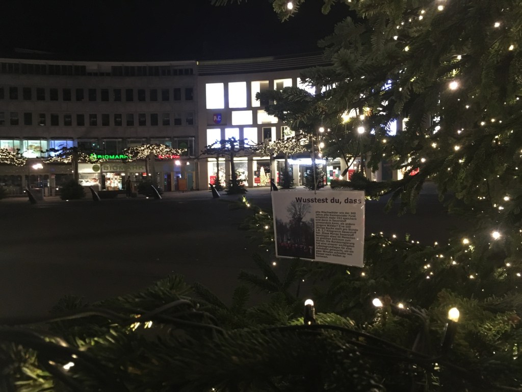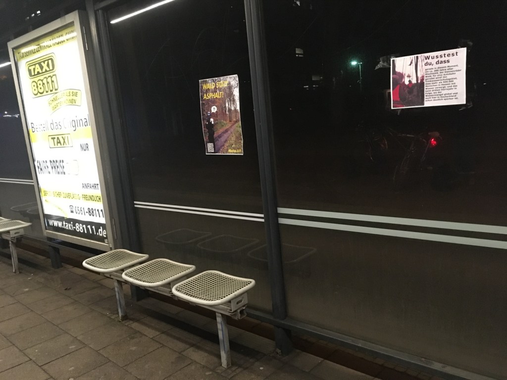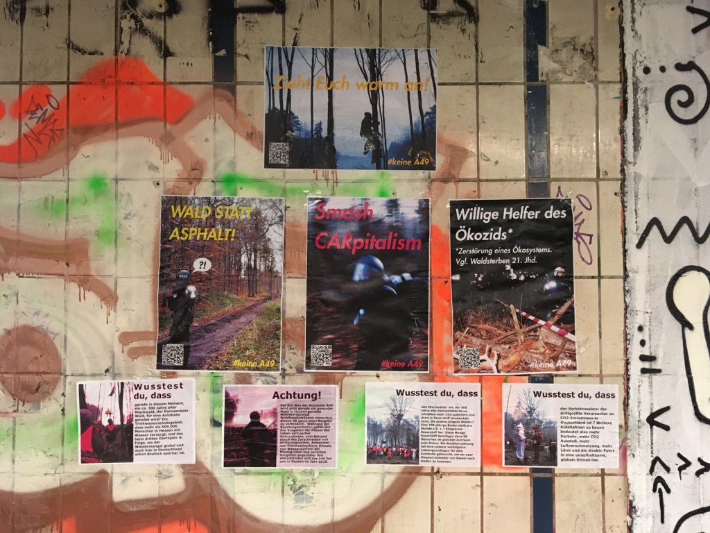 Klimaaktivist:innen haben am vergangenen Wochenende in Kassel ein Zeichen gegen den Bau der Autobahn A49 gesetzt und ihre Forderungen für eine nachhaltige Verkehrswende durch Plakate und Banner im Stadtraum deutlich gemacht. An zahlreichen Orten hängen Informationen über die Überlebensnotwendigkeit von Wäldern und Fotos aus dem Dannenröder Forst, die die Geschehnisse im Wald während der Rodungen sichtbar machen. Besonders viel Aufmerksamkeit bekommen die Infokärtchen am großen Tannenbaum am Königsplatz, die wie Weihnachtskugeln herunter baumeln.