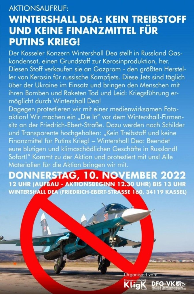 Kommt zur Die-In-Aktion von der Deutschen Friedensgesellschaft – Vereinigte Kriegsdienstgegner*innen (DFG-VK) und KligK am Donnerstag, 10. November ab 12:00 Uhr vor der Wintershall Zentrale (Friedrich-Ebert-Straße 160). Die auf Pressebilder ausgelegte Versammlung ist angemeldet und soll eine knappe Stunde gehen.