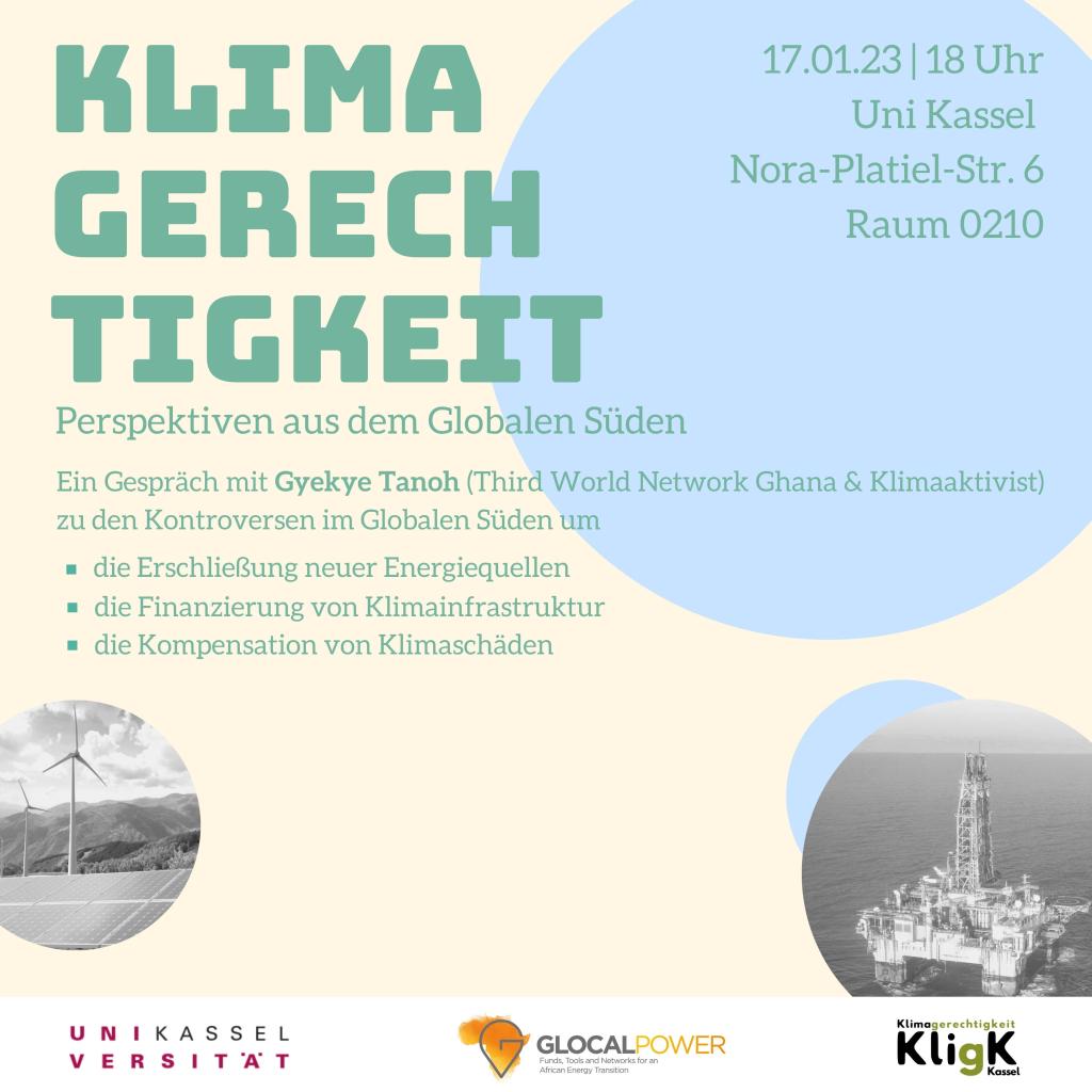 Klimagerechtigkeit: Perspektiven aus dem Globalen Süden Mit Gyekye Tanoh, Third World Network Ghana & Klimaaktivist Dienstag, 17.1.2023, 18 Uhr | Ort: Uni Kassel, Nora-Platiel-Straße 6, Raum 0210 Eine Veranstaltung des Fachgebiets Entwicklungspolitik und Postkoloniale Studien, der Nachwuchsgruppe GlocalPower und der Initiative Klimagerechtigkeit Kassel (KligK) Bei der letzten Weltklimakonferenz im November 2022 in Ägypten standen drei Themen besonders im Fokus internationaler Aushandlungen: Die Erschließung neuer Energiequellen für den Energiebedarf des Nordens, die Finanzierung von Klimainfrastruktur sowie der Kompensation von Klimaschäden im Globalen Süden. Diese und weitere Themen wollen wir mit unserem Gast Gyekye Tanoh (Third World Network Ghana & Klimaaktivist) diskutieren.