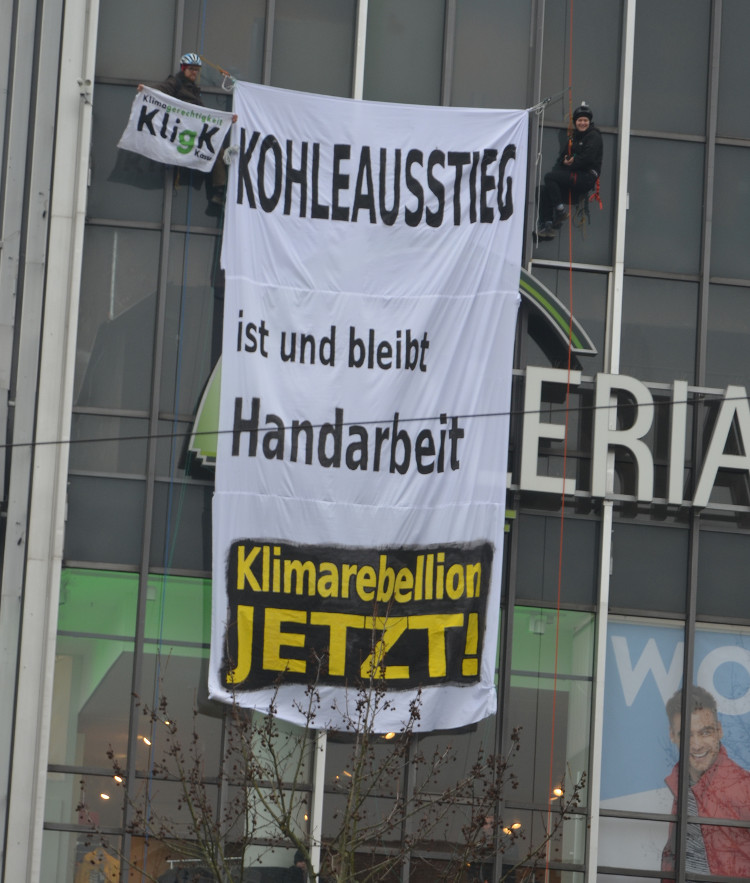 Nach dem desaströsen Ergebnis der Kohlekommission seilten wir in einer Kletteraktion ein riesiges Banner von einem Kaufhaus in der Innenstadt ab.