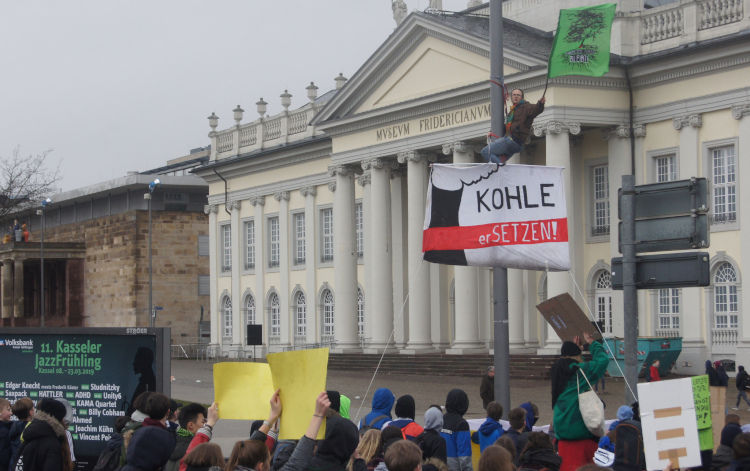Beim großen Fridays-For-Future-Klimastreik mit rund 2.500 jungen Kasseler*innen, den wir aus tiefstem Herzen unterstützen, entrollten wir an einigen Stellen entlang der Demoroute aus Gebäuden und von Masten herab Anti-Kohle-Banner.