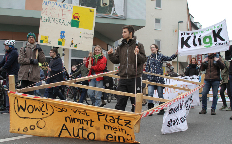 Für einige Zeit blockierten wir die Hauptverkehrsstraße Steinweg, um unserer Forderung nach einem klimagerechten statt autogerechten Kassel Nachdruck zu verleihen.