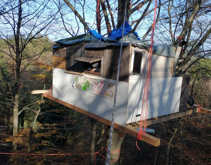 Die Proteste im Dannenröder Wald gegen den Bau der Autobahn A49 unterstützen wir tatkräftig. U.a. auch durch den Bau eines eigenen Baumhauses 18m hoch auf einer Buche, das die Rodungsarbeiten deutlich verzögerte.