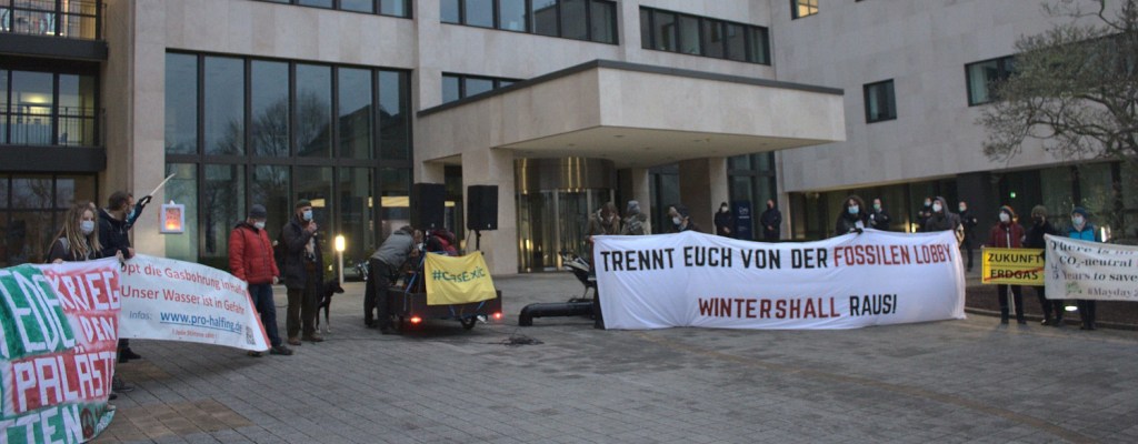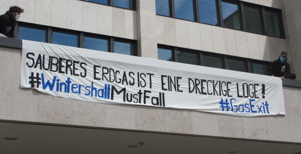 Am 21. Mai haben wir zusammen mit XR und GasExit die Konzernzentrale von Wintershall in Kassel per Banner mit einem neuen Slogan versehen: „Sauberes Gas ist eine dreckige Lüge“.