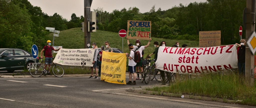 Anlässlich des Aktionswochenendes für die Mobilitätswende haben wir zusammen mit XR und keineA44 die Auffahrt zur A7 an der Kaufunger Papierfabrik blockiert.
