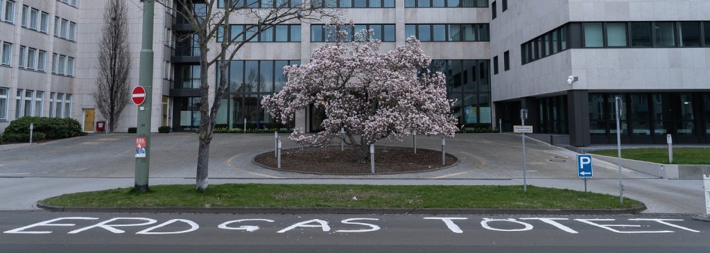 In den frühen Morgenstunden haben wir zum Aktionstag gegen Krieg und Klimakrise vor die Konzernzentrale von Wintershall Dea in großen Lettern „Erdgas tötet“ auf die Straße gemalt.