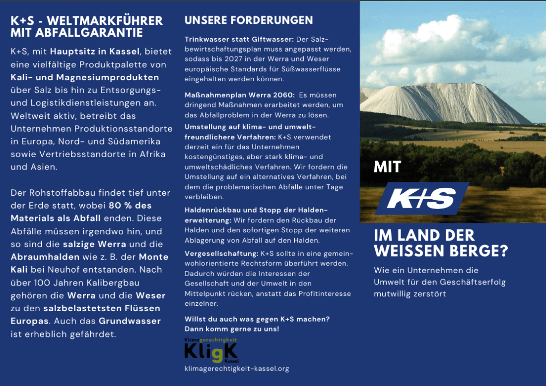 https://www.flickr.com/photos/160756601@N07/53931875283/in/album-72177720319331397 Gestern haben wir vor dem Regierungspräsidium protestiert. Die Weserminister*innenkonferenz, muss jetzt vom hessischen Umweltminister Jung einberufen werden, um die Grenzwerte für die Salzeinleitung in Werra und Weser drastisch zu senken. ❌ Profitinteressen der Bergbauindustrie dürfen nicht länger Vorrang haben vor Zugang zu sauberem und günstigem Trinkwasser für alle! 🚰 Konzerne wie K+S müssen vergesellschaftet … Weiterlesen Aktionsvideo: Protest gegen K+S