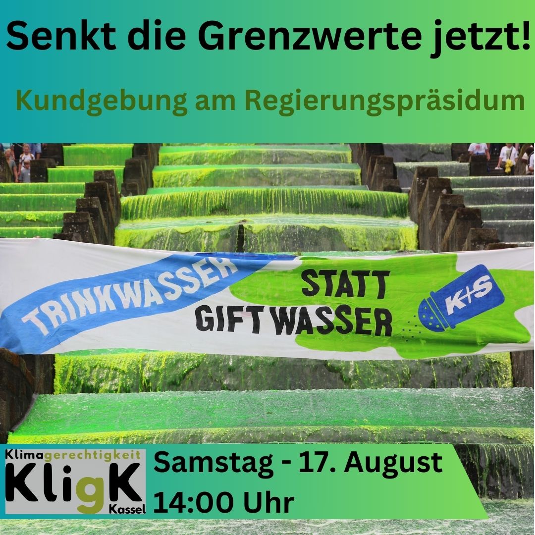 Zwei Wochen nach den grünen Wasserspielen wird es am morgigen Samstag um 14 Uhr mit dem bereits im Bergpark gesichteten Banner "Trinkwasser statt Giftwasser" eine Kundgebung vor dem Regierungspräsidium (Am Alten Stadtschloss 1) gegen den Kasseler Düngemittelkonzern K+S geben. Andere europäische Länder gewinnen über die Hälfte ihres Trinkwassers aus den Ufern ihrer Flüsse. Auch in … Weiterlesen Kundgebung Sa 17.8.: Trinkwasser statt Giftwasser: Kuscht die Landesregierung vor K+S?