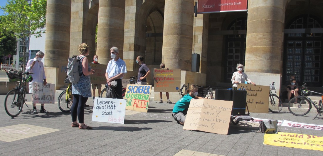 Vor der heutigen StaVo-Sitzung am 14.6. haben auf Einladung von Klimagerechtigkeit Kassel (KligK) Kasseler:innen vor der Stadthalle die Stadtverordneten mit Schildern und Fahrrädern zu einer schnellen Umsetzung des Integrierten Maßnahmenpakets Mobilität aufgefordert, das auch auf der Tagesordnung stand. Nachdem der Klimaschutzrat dieses wegweisende Maßnahmenpaket verabschiedet hat und auch die Koalitionsvereinbarung teils in diese Richtung geht, … Weiterlesen Mahnwache zum Maßnahmenpaket Mobilität