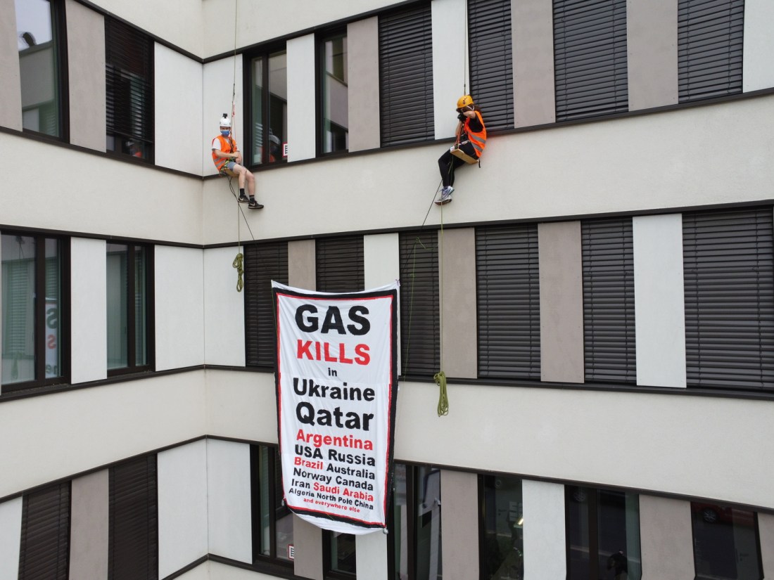 Vom Dach des umstrittenen Gaskonzerns WINGAS in Deutschlands Gashauptstadt Kassel haben wir uns abgeseilt und mit einem Banner "Gas kills" die drastische Reduktion des industriellen Energie- und Erdgasverbrauchs, den Investitionsstopp für alternative Erdgasquellen und die Vergesellschaftung der Gasindustrie gefordert. Denn: Erdgas tötet, in der Ukraine und durch die Klimakatastrophe weltweit.